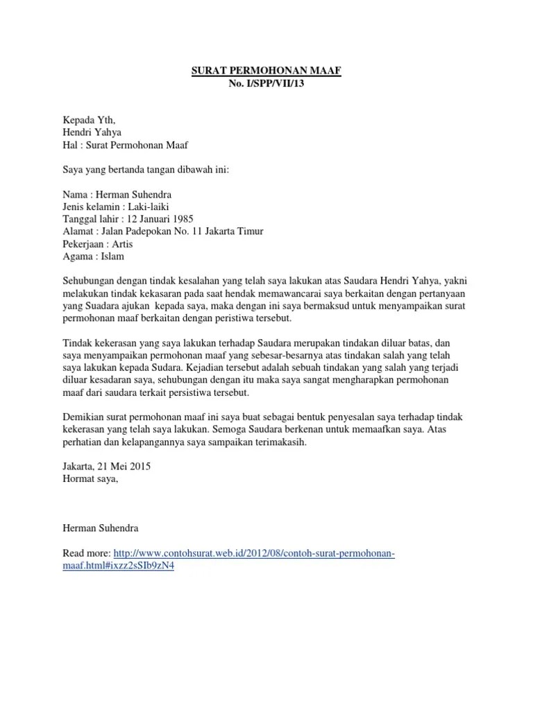 Anda pun bisa menggunakan beberapa . Jenderal badan peradilan umum dan seluruh jajarannya atas tindakan saya. Aku sama sekali tidak bermaksud . Berikut ini kumpulan contoh surat permohonan maaf, baik yang resmi maupun nonresmi, yang dapat kamu gunakan. Jika terjadi sesuatu hal yang kurang berkenan terhadap pelanggan, maka tidak ada salahnya untuk meminta maaf. Contoh surat permohonan maaf kepada guru, dosen, perusahaan, pacar, teman, orang tua, atas keterlambatan pengiriman barang dan kesalahan.